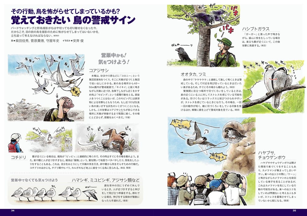 SNSなどでもたびたび話題となる「野鳥撮影のマナー問題」。鳥を愛するがゆえに観察や撮影を楽しむバーダーであれば、あえて鳥を怖がらせたい、警戒させたいと考える人はいないはず。ですが、野鳥観察歴が浅い人は特に、鳥が警戒しているときにどんな行動をとるのかわからず、知らず知らずのうちに怖がらせてしまうということも往々にしてあるかもしれません。本記事ではアオバズクやハヤブサ、シギ・チドリ類といった野鳥撮影者に人気の種をはじめとしたさまざまな鳥の警戒サインを、生きものイラストレーターの安斉 俊さんによるイラストで紹介します。フィールドで実際に鳥を観察・撮影するときは、鳥が本記事で紹介した行動をとっていないか気をつけましょう。