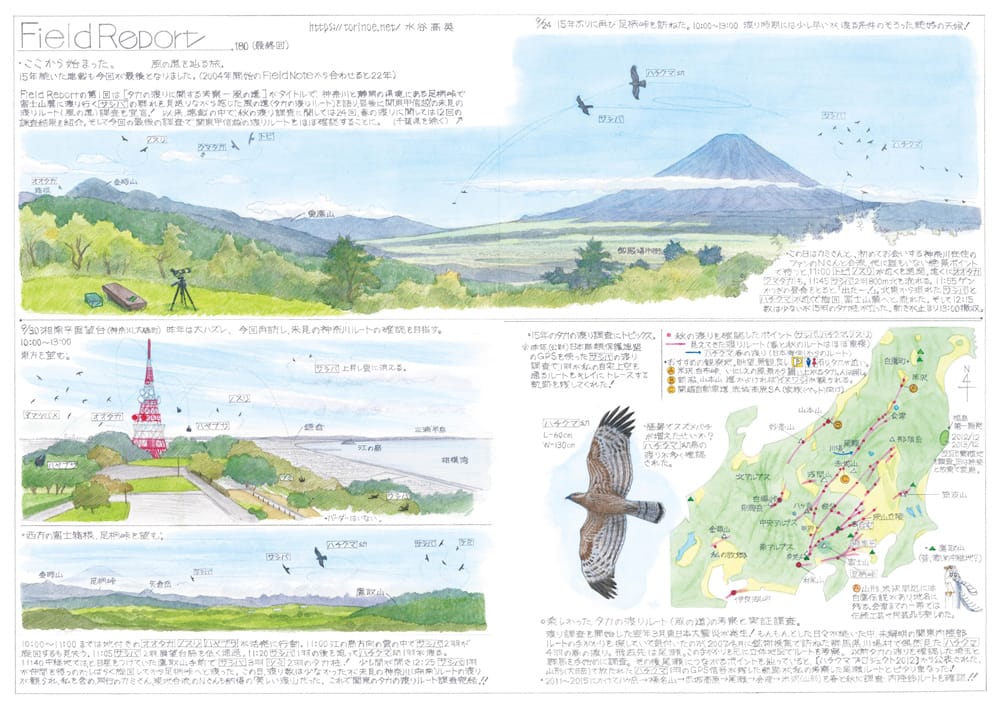 イラストレーターの水谷高英さんによる、全編手描きであたたかみのある優しいタッチのイラストが大人気の本連載がついに最終回を迎えます。水谷さんが日々の観察で見た鳥たちの様子を、その鳥のすむ環境とともにイラストと文章で解説しており、旬なニュースも多かったので、この記事を読んでさっそくあの鳥を観察しに出かけた!という読者も多かったのではないでしょうか。本記事では連載初回(なんと2011年1月=15年前!)でも紹介した、水谷さんが調査した関東甲信越のタカの渡りルートの集大成について紹介します。水谷さん、長い間楽しい連載をありがとうございました!