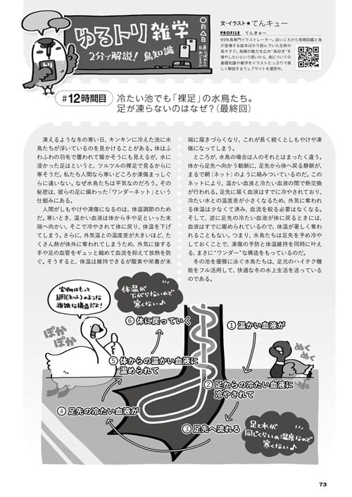 今回は水鳥たちがなぜ寒い水中にいても足が凍ったり凍傷にならないのか、そのメカニズムを解説しました。身も凍るような寒さの中、平然と泳ぐ鳥のヒミツが明らかに……。このメカニズムがわかっていれば、この冬、冷たい池を泳ぐ鳥たちも寒くないんだと安心して見守ることができます。鳥類学をやさしく紹介する「ゆるトリ雑学」は今回で最終回となります。応援いただいたみなさま、ありがとうございました!