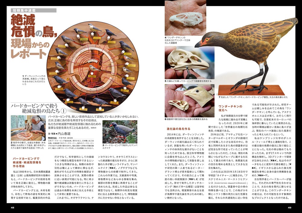 「バードカービング」を知っていますか? 簡単に言ってしまえば、木造の鳥の彫像です。内山春雄さんは木象嵌師でありながら、同時のバードカービングの日本の第一人者です。そんな内山さんが挑むのは、絶滅危惧の鳥や、絶滅してしまった鳥の復元です。個体数が激減して、標本も作れずにいた鳥たちを正確な姿で彫り上げ、その姿を人々に伝えること、また、古生物の研究者と協力して絶滅してしまった鳥の一部の骨格からありし日の姿を再現するなど、単なる工芸品の枠を超えた作品を作っています。絶滅危惧種を支える活動は直接的な研究だけでなく、こうした作品でも行なっていることがわかる記事になっています。次回は3月号に掲載予定です。
