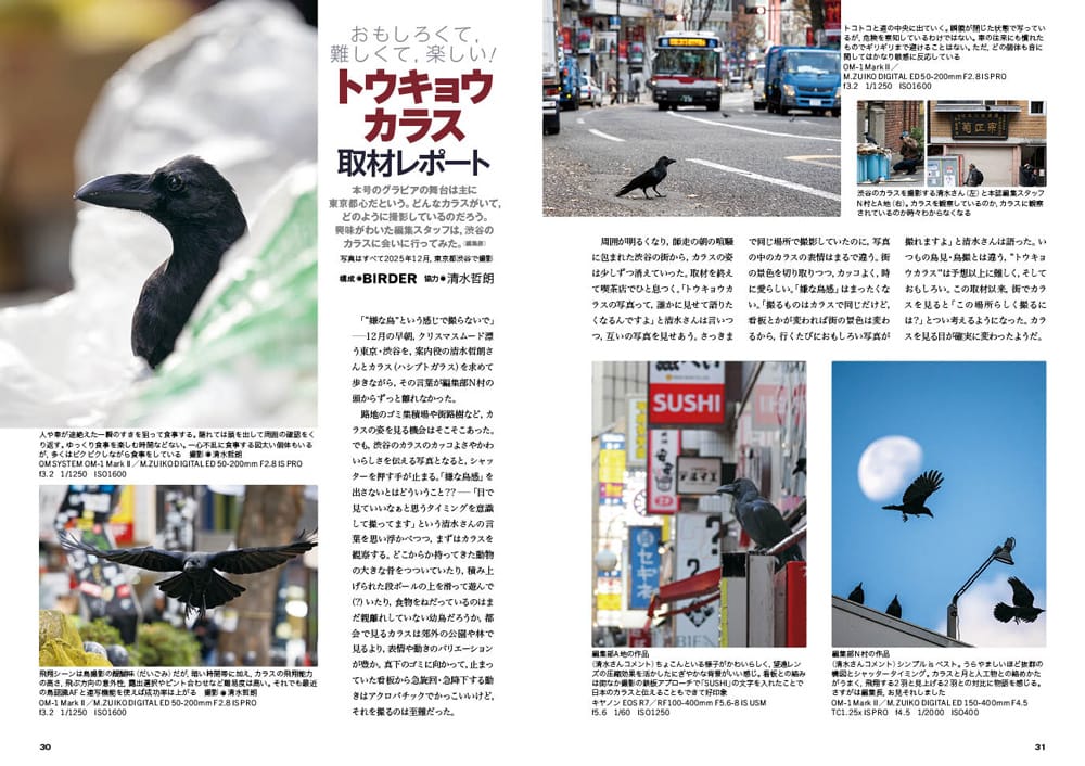 編集長N村と編集スタッフA地が、今号のBIRDER Graphics「街鴉」を担当した写真家の清水哲朗さんとともに早朝の渋谷で「トウキョウカラス」の取材に挑戦しました。取材に行く前まで、「カラスは街なかにもたくさんいるし、写真も撮りやすそうだ」と思っていたA地でしたが、カラスは食べ物のない通りにはほとんどいないし、9時くらいには姿を消してしまうので、撮影チャンスはわずか2時間ほど。いい写真を撮ろうとすると、意外と難しいことがわかりました。果たして、清水さんと編集部の2人はどんな観察をし、どんな作品を撮ったのでしょうか?「街鴉」とともに、詳しくはぜひ本誌でお楽しみください。