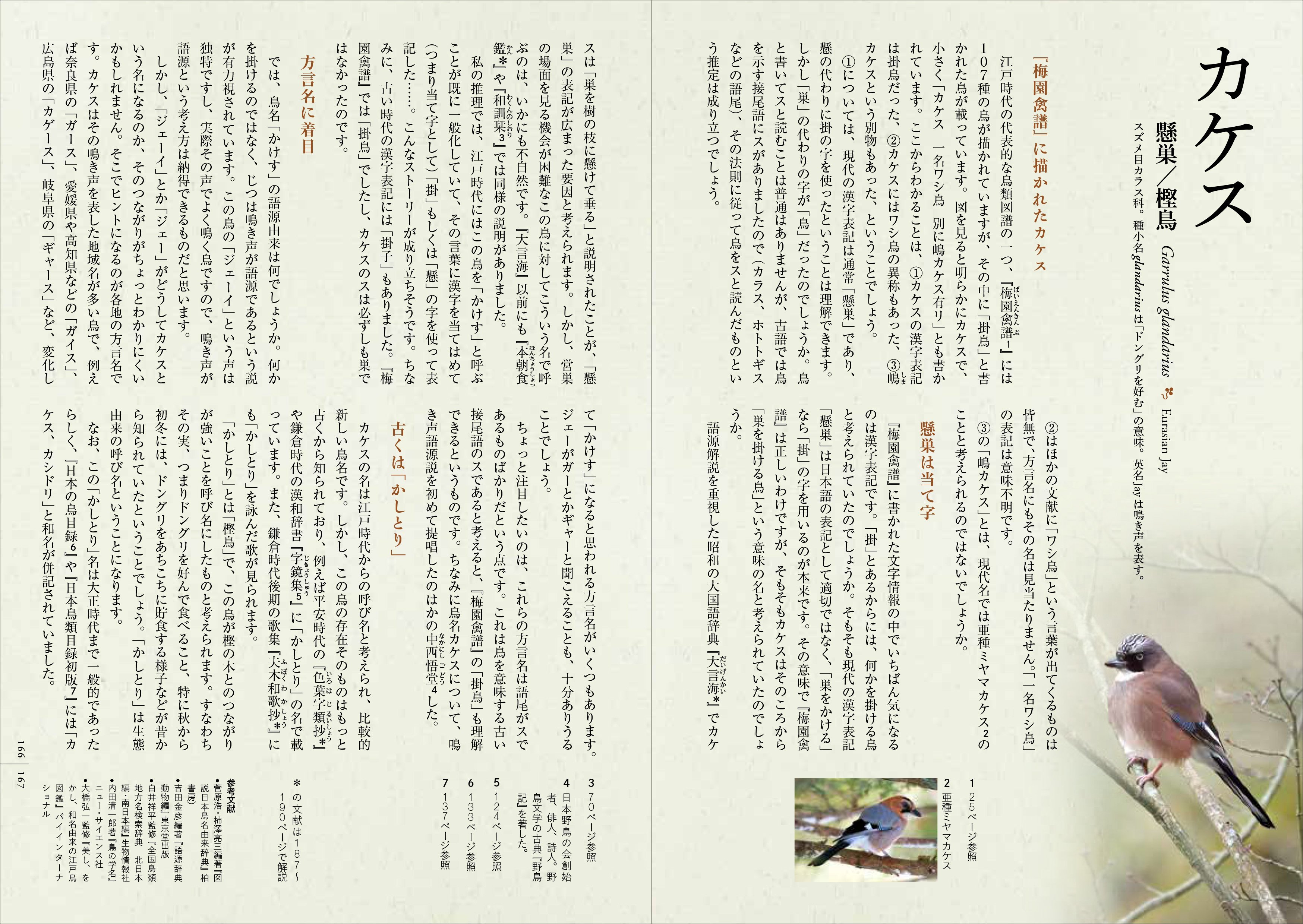 それと編集N村が個人的に好きな鳥で,名前の語源がよくわからなかったので,大橋さんに無理を言って収録してもらったのがカケスです。カケスの現在の漢字表記は「懸巣」で,かつては「掛巣」とも書いたらしいですが,鳥が巣を掛けること自体は普通なのに,なぜあえてこの鳥にその意味の名前を付けたのかが疑問だったのですが,大橋さんの調査のおかげでその謎が解けました(真相は本を読んでのお楽しみ)。