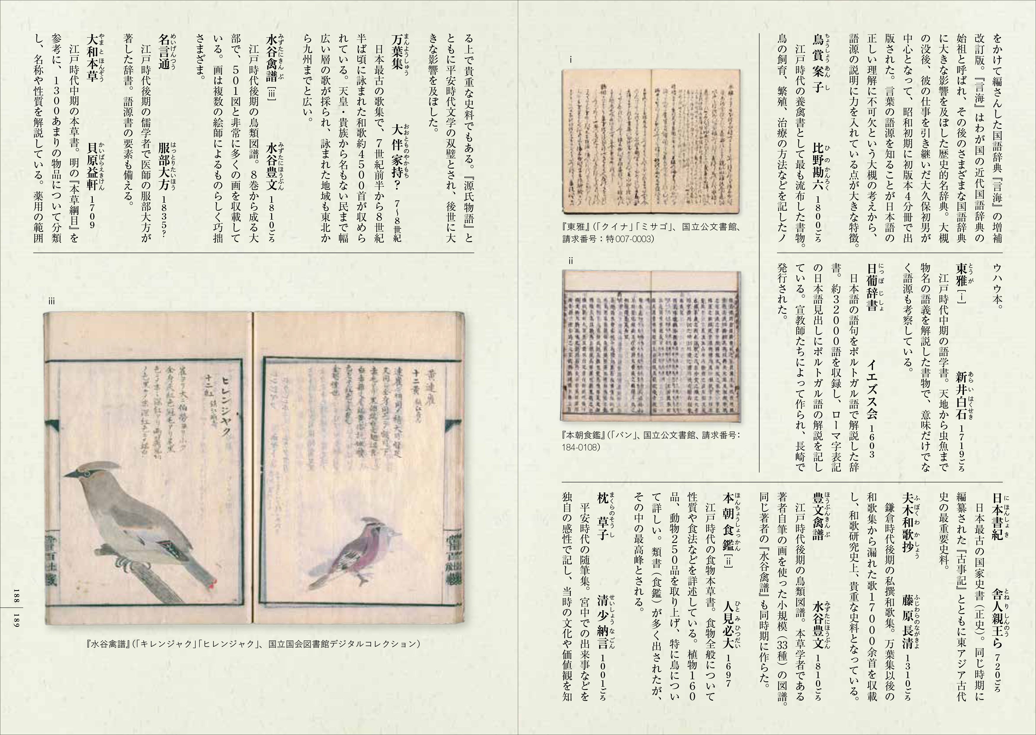 また,もう1つの新要素としてこだわったのが,名前の語源を調べるのに必要不可欠な古典文献の紹介です。この本にはみんなが知っている「古事記」「万葉集」だけでなく,「大言海(だいげんかい)」や「堀田禽譜(ほったきんぷ)」「本朝食鑑(ほんちょうしょっかん)」といった歴史の教科書でもなかなか見ないものまで,実に多種多様な文献が登場します。著者の大橋さんはその文献を1つ1つ読み解いて鳥の名前を取材したのですが,連載の時は紙幅の関係で書名を挙げるだけでした。鳥の名前,ひいては鳥自体が私たちの暮らしに密接にかかわっていたからこそ,さまざまな文献に鳥が登場するので,単行本化ではその文献をもっと紹介したいと思い,脚注や別ページを使って解説しました。