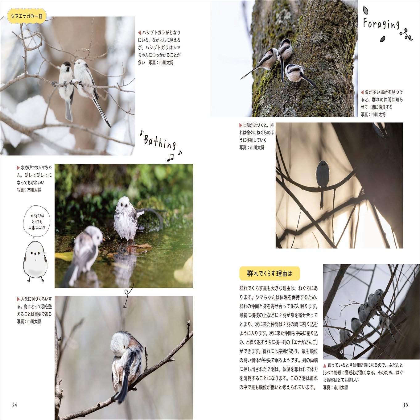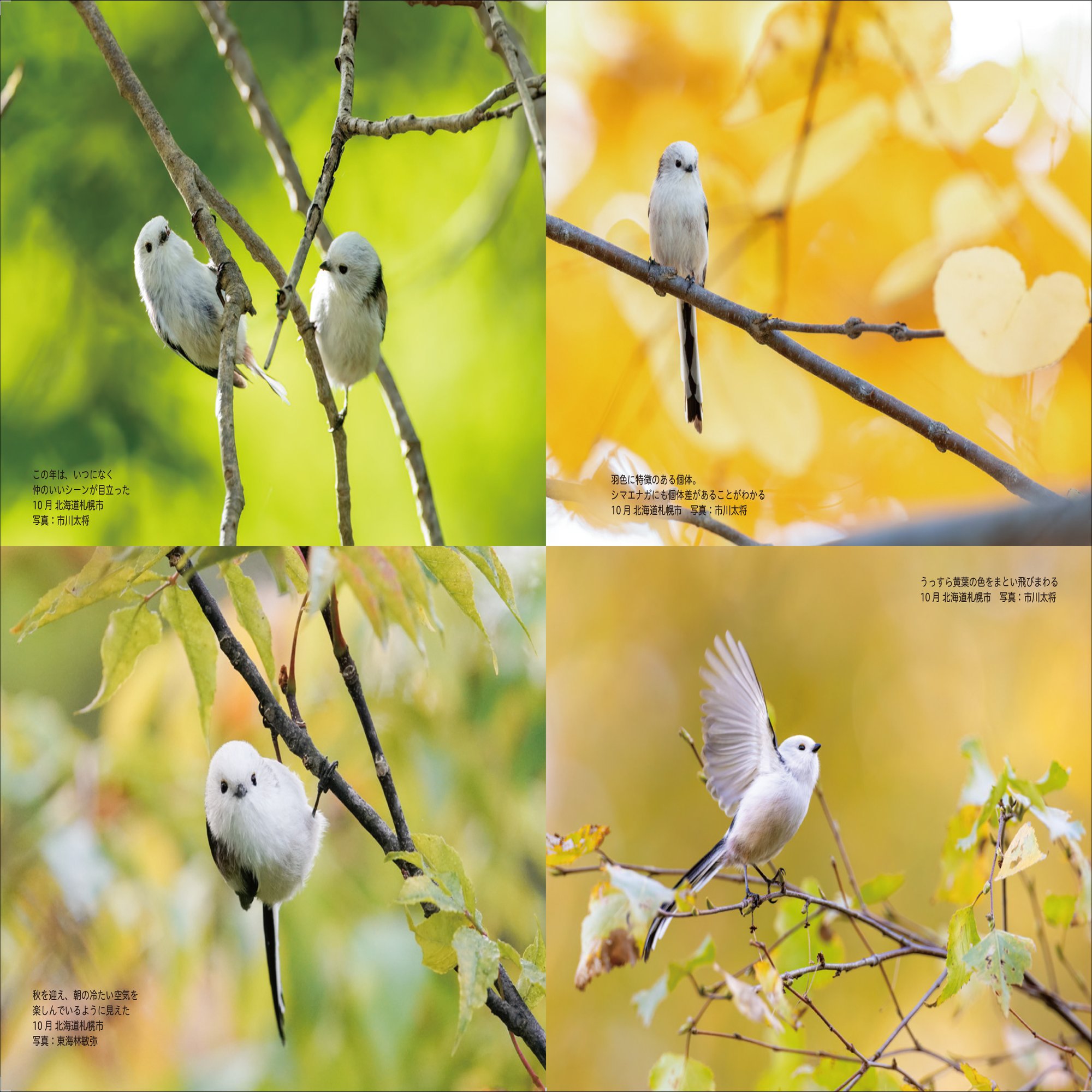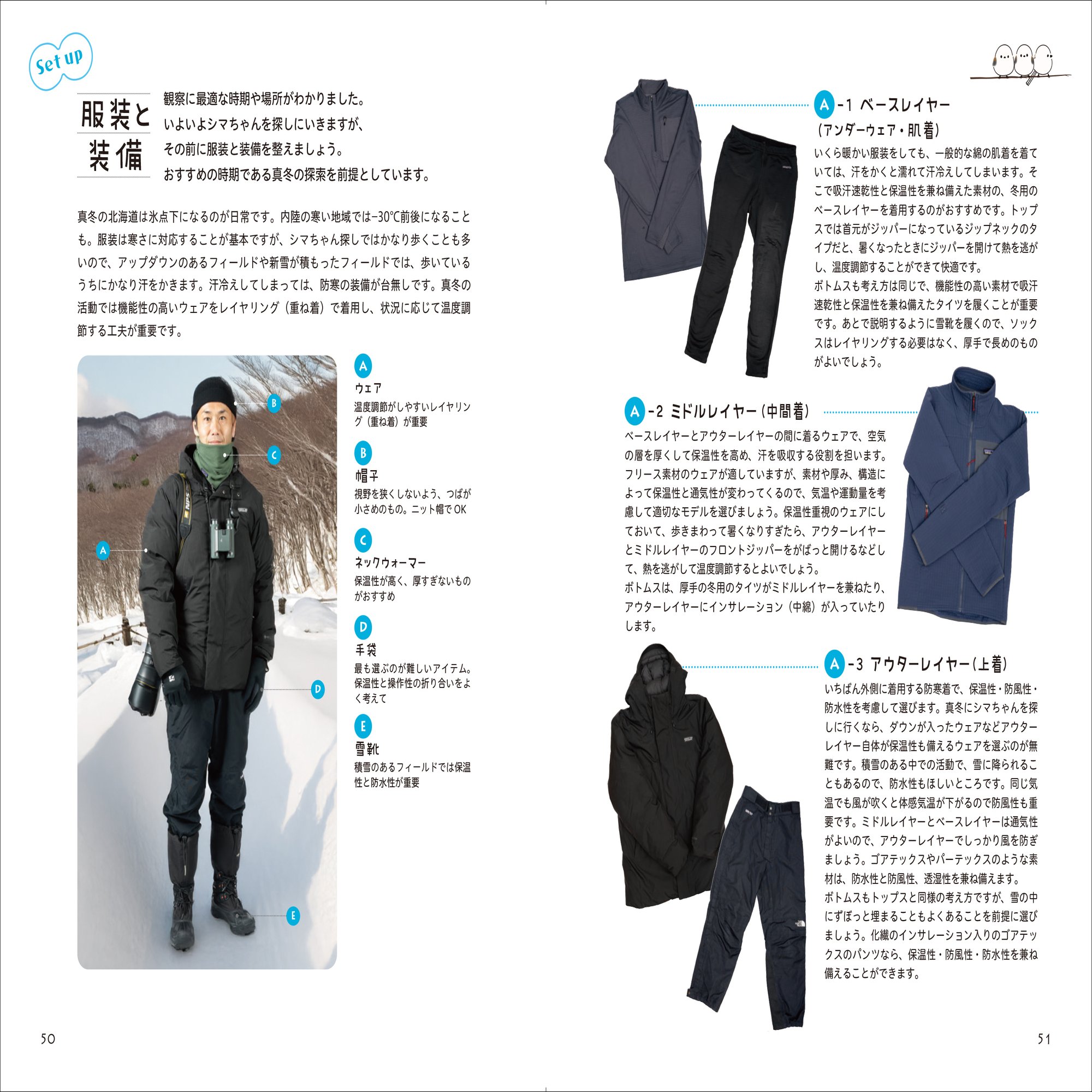 第2章では、シマちゃんのシルエット、動き方、4つのシマエナガ語(誌面の二次元コードを読み取ることで鳴き声聴くことができます)、群れをつくるほかの鳥との違いなどから、双眼鏡の選び方と使い方、真冬にどんな服装で臨むのがよいかまで、シマちゃんを探すために必要なあらゆる情報が充実しています。