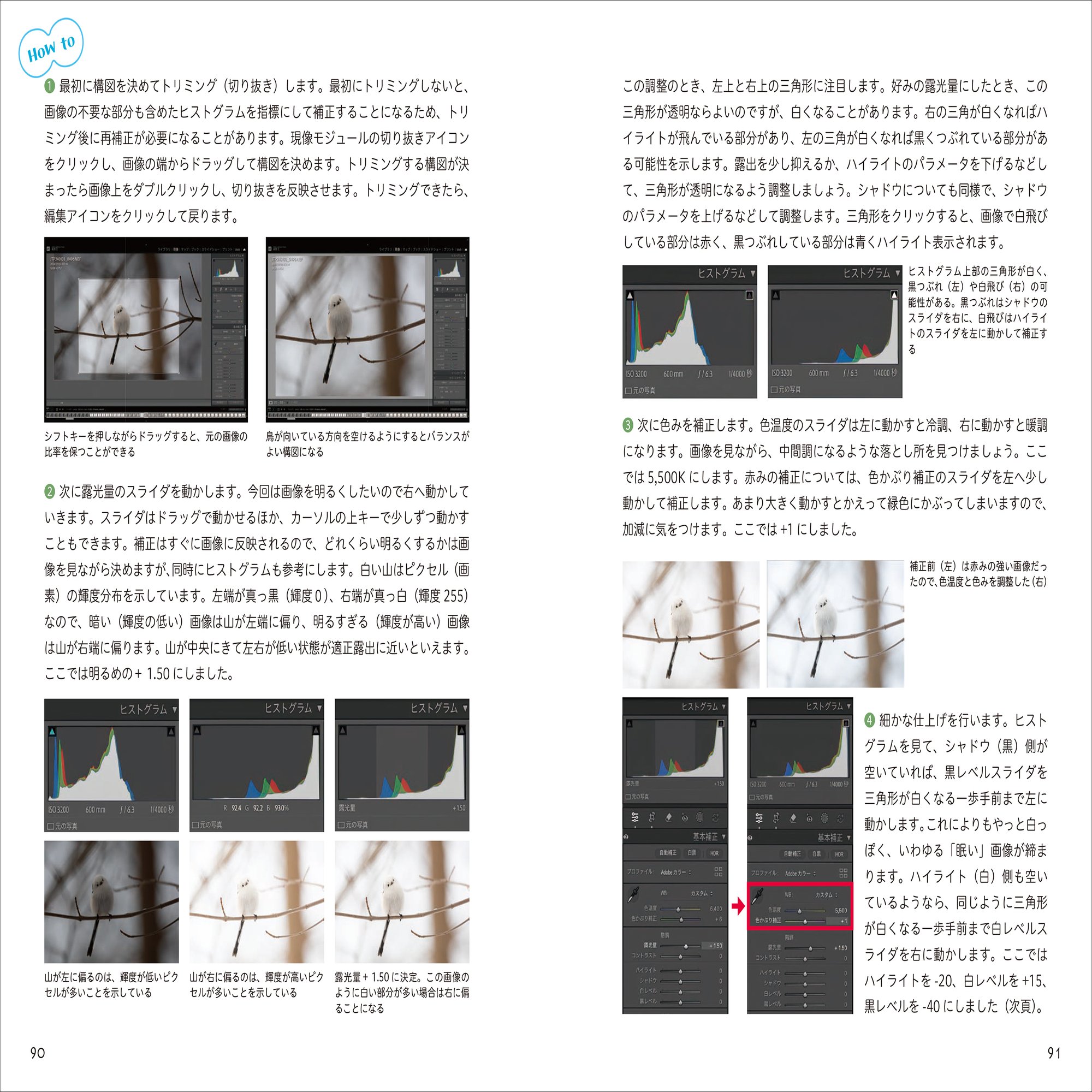 シマちゃんを見つけることができたら、いざ撮影です。第3章では、初級者からベテランまで、どんな機材を使うのがよいか、撮影の設定やシマちゃんの動きや撮りたい場面に応じた撮影方法、撮影時の鳥や人へ接するマナーまで詳しく紹介しています。さらに撮影したデータの仕上げ方(現像方法)も細かく解説し、プロフェッショナルのノウハウをすべて公開。シマエナガだけでなく、野鳥撮影全般に通じる資料的価値の高い情報を盛り込んでいます。