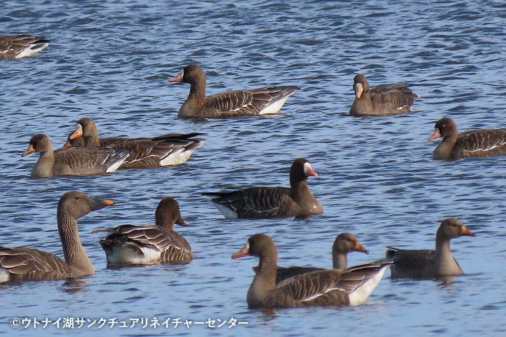 ウトナイ湖サンクチュアリネイチャーセンターLake Utonai Sanctuary 2025年12月 上旬から中旬にかけての湖上では、数十羽のオオハクチョウや、オナガガモ、ヨシガモ、ヒドリガモなどのカモ類、さらにマガンの姿を観察することができました。下旬には湖の大部分が結氷し、氷った湖面に佇むオジロワシやオオワシの姿を目にする機会が多くなってきました。観察路では、ハシブトガラやシジュウカラなどによるカラ類の混群やエナガ(亜種シマエナガ)やマヒワが木々の間を移動する様子が見られました。そのほかにも、オオアカゲラ、アカゲラ、コゲラなどのキツツキ類、キバシリ、カケス(亜種ミヤマカケス)、ウソなどが確認されました。 タイリクキジ、ヒシクイ、マガン、コブハクチョウ、オオハクチョウ、オカヨシガモ、ヨシガモ、ヒドリガモ、マガモ、オナガガモ、ホオジロガモ、カワアイサ、カイツブリ、ハジロカイツブリ、ダイサギ、ユリカモメ、カモメ、トビ、オジロワシ、オオワシ、チュウヒ、ノスリ、カワセミ、コゲラ、オオアカゲラ、アカゲラ、