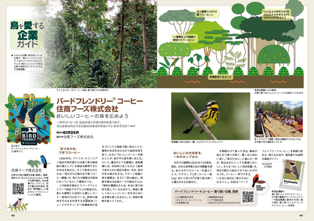 この連載で取り上げるのは、「鳥にとっていいことにつながる商品がある企業と商品」です。その初回に選んだのが、「バードフレンドリー®︎コーヒー」の取り組み。なんと、認証商品を購入すると渡り鳥の森をつくる活動の一助になれるというものです。なんとそのうえ、このバードフレンドリー®︎コーヒーはコーヒー農園を渡り鳥の休憩所として機能させるため、通常のコーヒーとは栽培方法からして異なります。それがおいしいコーヒーになる秘訣にもなり、一杯で二度、三度おいしいコーヒーなのです。どんな取り組みか、ぜひ本誌でご覧ください。